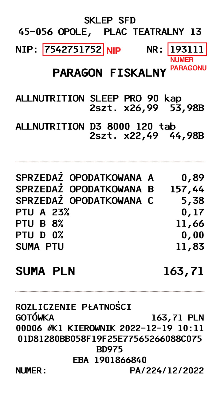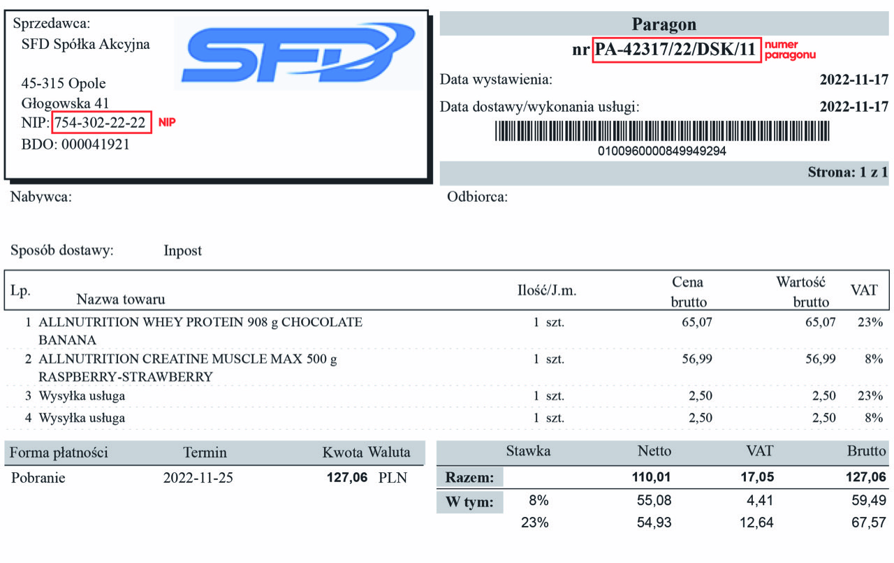 *dowód zakupu - tj. paragon, faktura wystawiona na osobę fizyczną, bez nip kupującego